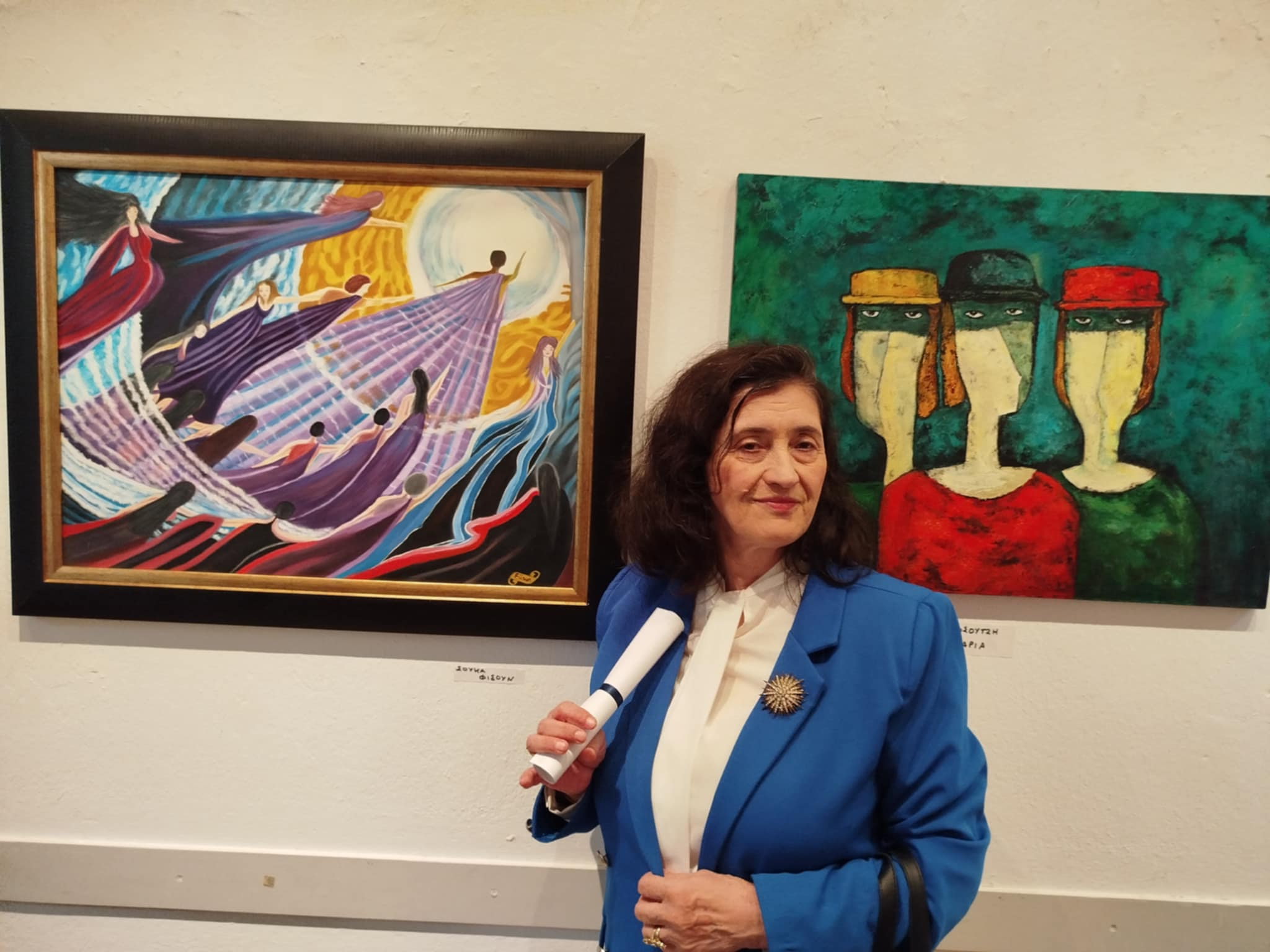 Η ζωγράφος κα. Φυσούν Σουγκά που παραδίδει μαθήματα στον σύλλογο καλλιτεχνών "ΑΘΗΝΙΩΝ", παρουσίασε το έργο της που απεικονίζει γυναίκες να κολυμπάνε προς το φως, που όπως μας εξήγησε αυτό επιθυμεί, οι γυναίκες να βγαίνουν μπροστά, να πηγαίνουν στο φως, να μιλάνε.